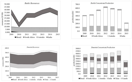 A comparison of Brazilian heavy mineral resources and production with other countries is given every year by the National Department of Mineral Production (DNPM) [1]. Data compilation from 2009 to 2015 for ilmenite, rutile, and zircon are shown in Figure 2. Although Brazil has modest resources and production of zircon concentrate, in the national market of heavy mineral sands, ilmenite and rutile concentrates are considered the main products. Indeed, in more recent data [25], Brazilian ilmenite resources are still considered small, only about 5.6% of global resources. As described in Technical Report 36 [26], Brazilian production of titanium concentrates (ilmenite plus rutile) has oscillated considerably, with the most relevant decline since 1986 occurring in 2001, when production was only 64,450 tons. The highest titanium production, however, was in 2007 with 226,865 tons, and in 2015, the most recent data, was 81,000 tons [1].