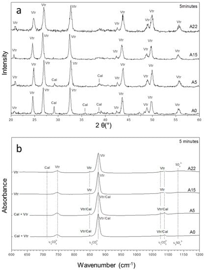 The XRD and FTIR analyses of the precipitates evidence that, soon after their formation (ageing time = 5 min), they mainly consist of vaterite, with calcite present as a minor phase. The amount of calcite in the precipitate in a 5 min reaction progressively decreases as the initial (SO42−)/(CO32−) ratio in the aqueous solution increases. This is clearly evidenced by the increase in the intensity of the peaks assigned to vaterite and the decrease of those attributed to calcite in the diffraction patterns recorded in the samples corresponding to this ageing time (Figure 1a). Thus, the amount of calcite is significant in A0, where the initial (SO42−)/(CO32−) ratio in the aqueous solution is 0, while no calcite is detected in experiment A22 when the initial (SO42−)/(CO32−) ratio is 60.0. The FTIR spectra show absorbance band characteristics of vaterite and/or calcite, whereas the presence of aragonite is not detected (Figure 1b). A very weak band at approx. 1130 cm−1 (found in the spectrum of precipitates from experiments A5–A22 but absent in that corresponding to the solids formed from sulphate-free solution A0) can be assigned to sulphate ions incorporated in the structure of vaterite and/or calcite.