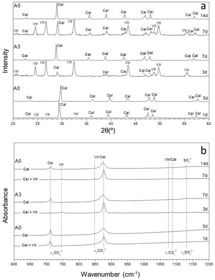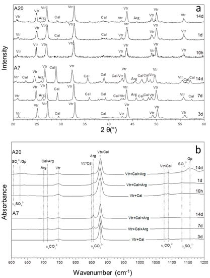 A different mineralogical evolution trend is observed in experiments A7 to A20, where the initial (SO42−)/(CO32−) ratio in the aqueous solution varies between 19.51 and 54.87 (Figure 3). In this case, the formation of aragonite is also observed during ageing. This CaCO3 polymorph appears as a constituent of the precipitate formed after ageing times that are shorter, as the initial (SO42−)/(CO32−) ratio in the aqueous solution is higher. Thus, aragonite is detected in the precipitate formed in A7 and A15 after 7 days of ageing, while this phase is found much earlier in the precipitate formed in A20 after only 1 day of ageing. This evolution trend is particularly evident in the FTIR spectra, which show weak bands at approx. 699 cm−1 and 712 cm−1 and at approx. 855 cm−1, consistent with the positions of the υ4 antisymmetric bending and υ2 out-of-plane vibrations of carbonate ion in aragonite, respectively. These bands are absent in the precipitates formed after short times of ageing (3 days and shorter for A7 and A15 and 10 h and shorter for A20). It is worthwhile to note that after 14 days of ageing, these precipitates consist of the three CaCO3 polymorphs, vaterite, aragonite, and calcite, together with gypsum as a minor phase. Calcite is still the most abundant phase in A7, whereas vaterite is the most abundant one in A15 and A20 (Figure 3a). Bands at 1130, 628, and 608 cm−1, particularly evident in the precipitate formed in A20 after 14 days of ageing, can be assigned to sulphate ions incorporated into the lattice of the CaCO3 polymorphs.