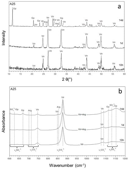 The XRD patterns (a) and infrared spectra (b) of precipitates sampled from aqueous solutions with the highest (SO42−)/(CO32−) ratio (67.6) (A25) as a function of time.
