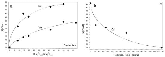 Finally, ICP-OES analyses of the S concentration in the aqueous solution show that at 5 min of reaction, the concentration of S in the aqueous solution is progressively lower than the initial aqueous solution as the initial (SO42−)/(CO32−) ratio in the aqueous solution increases (Figure 7a). Furthermore, the concentration of S in the aqueous solution varies with ageing time, following similar trends independently of the initial (SO42−)/(CO32−) ratio in the solution (Figure 7b). Thus, the concentration of S in the aqueous solution is characterized by a rapid drop followed by a progressive increase as ageing progresses.