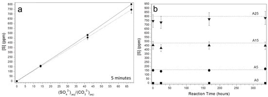 (a) The concentration of S (from inductively coupled plasma-optical emission spectrometry (ICP-OES) analyses) in aqueous solutions sampled after 5 min of reaction as a function of the initial (SO42−)/(CO32−) ratios (dashed lines): The initial concentrations of S in the solutions are connected by a solid line. (b) The evolution of the concentration of S (from ICP-OES) of aqueous solutions with initial (SO42−)/(CO32−) ratios of 0 (A0), 14.3 (A5), 41.8 (A15), and 67.7 (A25), respectively.