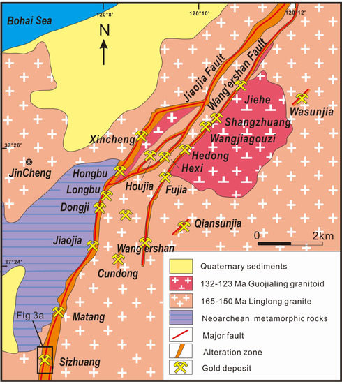 The major gold deposits in the Jiaobei Uplift are controlled by the NE- to NNE-trending fault system which cut through Linglong granite [4]. The main faults from the west to east are Sanshadao, Jiaojia, Zhaoping, and Qixia Fault. All these faults are the subsidiary faults of the Tan-Lu Fault Zone (Figure 1). The Jiaojia Fault, which is the ore-controlling fault at the Sizhuang gold deposit (Figure 2), is one of the most significant faults in Jiaobei Uplift.
