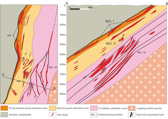 A sketch map of the Sizhuang gold deposit showing the orebodies and hydrothermal alteration: (a) The plan view of the Sizhuang deposit and (b) the geological cross sections along lines AB. The orebody was defined by the gold cut-off grade (1 g/t).