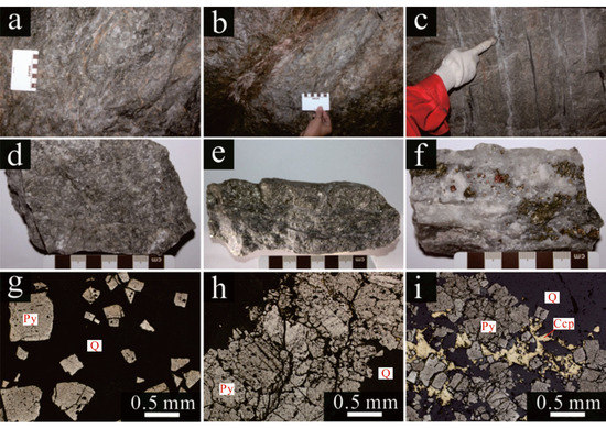 Photography of the three styles of ores: (a,d) Disseminated-stockwork style; (b,e) Auriferous quartz vein style; (c,f) sulfide-quartz veinlet in K-feldspar alteration granite; and (g–i) photomicrographs in the reflected light of the disseminated-stockwork type, auriferous quartz vein style and sulfide-quartz veinlet in K-feldspar alteration granite, respectively.