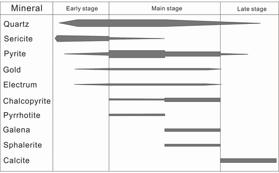 As is pointed out above, there is no difference between different mineralization styles in mineral paragenesis in the Sizhuang gold deposit. The primary metallic mineral in ores is pyrite with lesser chalcopyrite, galena, sphalerite, pyrrhotite, and electrum. The gangue minerals mainly contain sericite, quartz, and calcite (Figure 6). With the study of cross-cutting relationships, textures, and mineral paragenesis, three mineralization stages have been divided which include the early stage, main stage, and late stage (Figure 7).