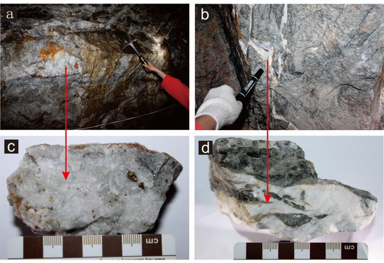 All gold mineralization occurs in the footwall of Jiaojia fault. The orebody is mainly controlled by the NE- to NNE-trending and SE-dipping Jiaojia fault system (Figure 2). The secondary faults, which are often filled with quartz veins and are surrounded by hydrothermal zones with a width from 0.5 m to more than ten meters, can be several hundreds to one thousand meters long and 0.1–1.5 m wide (Figure 3).
