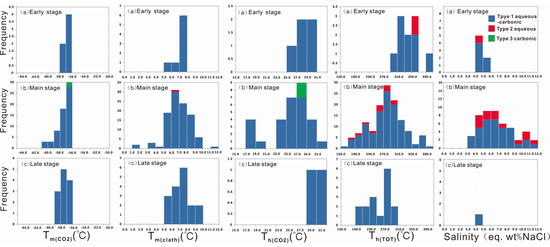 For type 1 inclusions (Figure 10; Table 2), the carbonic phase melting temperatures (TmCO2) of H2O–CO2 inclusions ranged from −60.5 to −56.5 °C (mean −57.6 °C, n = 55). The integral clathrate-melting temperature (Tmclath) was between 5.2–7.9 °C (mean 6.9 °C, n = 92). The homogenization of CO2 (ThCO2) occurred in the vapor phase range 17.6 to 30.5 °C (mean 25.7 °C, n = 24) which was much wider than the range of the type 1’s ThCO2 in early stage, which suggested the possibility of a bigger density change in main stage. The total homogenization (ThTOT) into liquid occurred between 165 and 342 °C (mean 272 °C, n = 100). Some of the type 1 inclusions contained second phases at room temperature, which made them look like aqueous inclusions. However, when the temperature approximately cools down to 16 °C, they became 3-phases inclusions.