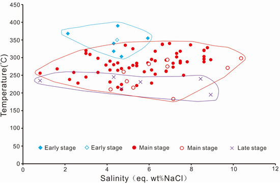 The salinity (wt % NaCl eq.) and density of fluid inclusions were calculated by the software MacFlincor [31]. These calculations were applied to the H2O–CO2 inclusions (Type 1) and aqueous inclusions (Type 2). The measured salinities of type 1 H2O–CO2 inclusions were between 4.14 and 8.93 wt % NaCl eq. (meanly 5.99–8.93 wt % NaCl eq.). Those of type 2 aqueous inclusions were 4.17–11.83 wt % NaCl eq. (meanly 4.17–9.73 wt % NaCl eq.). On the whole, the range of fluid salinity in the Sizhuang gold deposit was 4.14–11.83 wt % equiv. NaCl (Figure 10; Table 2).