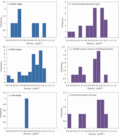 Histograms of the density of type 1 fluid inclusions: The range of inclusion density is wide in different stages or in different mineralization styles.