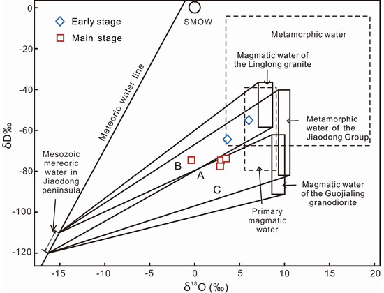 The H–O composition of ore-fluids in early and main stages: Area A means metamorphic water of the Jiaodong Group mixed with meteoric water; Area B means magmatic water of the Linglong granite mixed with meteoric water; and Area C means magmatic water of the Guojialing granite mixed with meteoric water. The base map is modified after Guo et al. (2014) [53].