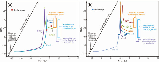 The H–O isotope composition of granite and metamorphic rocks in the giant Jiaodong gold deposit can be replaced by δDbiotite and δ18Oplagioclas (An30) [50]. of δO18 and δD were calculated and demonstrated in this system as follows [48,55]: