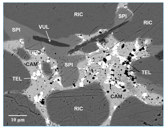 Scanning Electron Microscopy-BackScattered Electron (SEM-BSE) image of spiridonovite (SPI) associated with cameronite (CAM), rickardite (RIC), vulcanite (VUL) and tellurium (TEL).