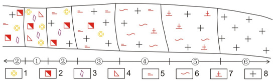 Sketch of alteration zone in the Huangsha uranium mining area. ①—Silicification alteration zone; ②—Hematization alteration zone; ③—Hydromicazation alteration zone; ④—Chloritization alteration zone; ⑤—Kaolinization alteration zone; ⑥—Fresh granite. 1—Silicification; 2—Hematization; 3—Fluoritization; 4—Tectonic breccia; 5—Hydromicazation; 6—Chloritization; 7—Kaolinization; 8—Granite.