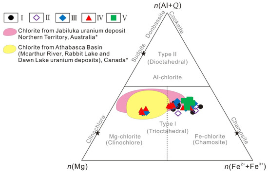 Based on a large number of substitute relationships of chlorite, previous researchers proposed a complex classification and nomenclature method, i.e., the classification diagram of Fe-Si components of chlorite [1,43,48]. This method has been abolished by the International Association for the Study of Clays (AIPEA), because there is neither genetic significance nor structural information for chlorite. Table 3 and Table 4 show the cation numbers and characteristic parameters of chlorites from Huangsha uranium mining area, which is calculated on the basis of 28 oxygen atoms. Based on the (Al + Q)–Mg–Fe compositional classification diagram which was proposed by Zane and Weiss (1998) [49], chlorites were classified and named in Figure 6. It shows that the chlorites in Huangsha uranium mining area are mainly trioctahedral-chamosite, partly trioctahedral-clinochlore, and most of them belong to iron-rich chlorite. Among them, type-I type-II, and type-V chlorites are all composed of trioctahedral-chamosite; type-III and type-IV chlorites are mainly composed of trioctahedral-chamosite, and a few are composed of trioctahedral-clinochlore. This is obviously different from the Fe–Mg chlorite in unconformity-type uranium deposits in Canada (uranium deposits in the Asabaska Basin) and North Australia (Jabiluka uranium deposit) (Figure 6). Inoue (1995) [50] show that iron-rich chlorite is formed more easily in relatively acidic reduction environments, and the formation of iron-rich chlorite may be related to the boiling of the metallogenic fluid. The chlorite (especially type-IV chlorite, which is closely associated with uranium minerals) in Huangsha uranium mining area shows iron-rich potential, which indicates that the uranium deposits in this area were formed in a relatively acidic reduction environment, and the reduction environment is conducive to uranium mineralization. This is consistent with the results of Guo et al. (2012) [51] and Zhang et al. (2017) [52] on the metallogenesis of uranium deposits of North Guangdong in the Middle Nanling Range. Nutt (1989) [53] studied chlorite from the Jabiluka uranium deposit and suggested that Mg-rich chloritization was the product of alteration by a Mg-rich fluid, perhaps a brine, at high values of the fluid–rock ratio.