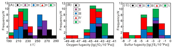 Histogram of formation temperatures, oxygen fugacity, and sulfur fugacity for chlorites from Huangsha uranium mining area. A—The formation temperatures frequency distribution histogram of chlorites. B—The formation oxygen fugacity frequency distribution histogram of chlorites. C—The formation sulfur fugacity frequency distribution histogram of chlorites. I—Chlorite from biotites, II—Chlorite closely associated with feldspar, III—Chlorite occurring in veins, IV—Uranium-associated chlorite, V—Chlorite transformed from clay minerals.