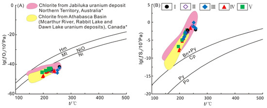 lg(ƒO2/10−5 Pa) values of oxygen fugacity and lg(ƒS2/10−5 Pa) values of sulfur fugacity buffers as functions of temperature. Base maps are according to Eugster and Wones, (1962) [65]; Ling, (2011) [63]; Liu et al. (2016) [66]. A—The diagram of the oxygen fugacity buffers as functions of temperature. B—The diagram of sulfur fugacity buffers as functions of temperature. Abbreviations: Hm—hematit; Mt—magnetit; Bn—Bornite; Py—pyrite; Cp—chalcopyrite; Po—pyrrhotite; Ni—nickel; NiO—nickel oxide. I—Chlorite from biotites, II—Chlorite closely associated with feldspar, III—Chlorite occurred in vein, IV—Uranium-associated chlorite, V—Chlorite transformed from clay minerals, *Data from [53,54,55].