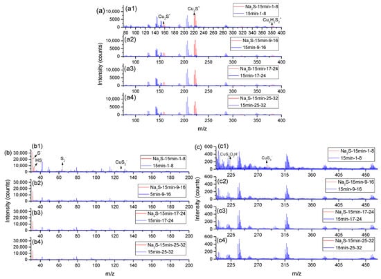 Cumulative mass spectra at different depths at pH 9: (a) positive spectrum; (a1–a4) are cumulative positive spectra obtained from scans 1–8, 9–16, 17–24, and 25–32, respectively; (b) and (c) negative spectra; (b1) (c1), (b2) (c2), (b3) (c3), and (b4) (c4) are cumulative negative spectra obtained from scans 1–8, 9–16, 17–24, and 25–32, respectively. Red and blue lines represent sulfidized and unsulfidized malachite, respectively.