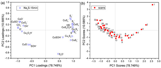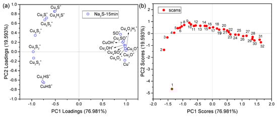 Figure 4b shows that the 32 negative spectra are well separated in the score plot. From scan 1 to scan 32, the PC1 score gradually decreased from positive to negative. The combined results in Figure 4a,b led to the conclusion that the sulfidization degree of malachite decreased with increasing etching depth. Similarly, the scores for scan 1 to scan 32 for PC2 gradually change from positive to negative, and then to positive. This indicates that sulfidized malachite contains different sulfidization species at different depths. The first scan (depth = 0 nm) had the largest positive score and the largest distance from other points in PC2. Therefore, there is a significant difference of sulfur-containing compounds between the surface and inner of sulfidized malachite. According to the results in Figure 4a, we can see that scans 1–3 had strong correlations with S3−, CuS4−, S4−, HS−, CuS3−, CuS4O2H−, Cu2S3−, S−, and S2−; scans 4–21 were strongly correlated with Cu2S2−, CuS2−, CuSOH−, S2O−, CuS−, and SOH−, and scans 22–32 had strong negative correlations with negative fragment ions such as Cu2O3H−, O−, CO3−, OH−, CuO2−, CuSO−, and CuO−.