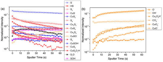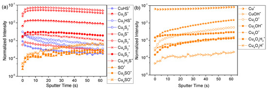 The depth profile curves of the positive fragment ions in Figure 5a,b show that the curves can be broadly divided into three categories. The blue line represents the first type: CuHS+, Cu2HS+, and Cu2S2+, whose fragment ion intensity decreased with increasing etching depth. The red line represents the second type: Cu3S2+, Cu4S2+, Cu5S2+, Cu2S+, Cu3S+, and Cu3H2S+, whose fragment ion intensity first increased and then decreased with increasing etching depth. The orange line represents the third type: Cu+, Cu3O+, Cu2O+, Cu4O2+, Cu4SO+, CuOH+, Cu2SO+, Cu4O3H2+, Cu2OH+, and SO+, whose fragment ion intensity increased with increasing etching depth.