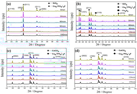 Figure 1 shows the XRD patterns of the PR1, PR2, and PR3 samples at different milling times. It is generally believed that the collophane is amorphous. Indeed, it is composed of apocrystalline or ultra-microcrystalline apatite microcrystals, as confirmed by electron microscopic results [,]. Based on the phase analysis, it can be concluded that the PR1 is mainly composed of fluoroapatite [Ca5(PO4)3(F,OH)] (Figure 2) and quartz (SiO2) phases (Figure 1a). The diffraction peaks from both phases in the PR1 sample did not change significantly. Compared to the raw materials, the (002), (211), and (300) crystal face diffraction peaks of [Ca5(PO4)3(F,OH)] did not remarkably decrease, whereas the diffraction peaks of the quartz, the (110), and the (011) crystal faces increased slightly with the increase of milling time when compared to the raw materials. Indeed, a slight lattice distortion appeared in the microcrystalline PR1, whereas the crystal structure did not change significantly, which is consistent with the fact that the quartz is a mineral with a high degree of crystallinity and is difficult to grind.
