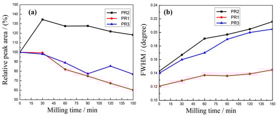 Relative peak areas (a) and half-widths (b) of three PR powders at different milling times.