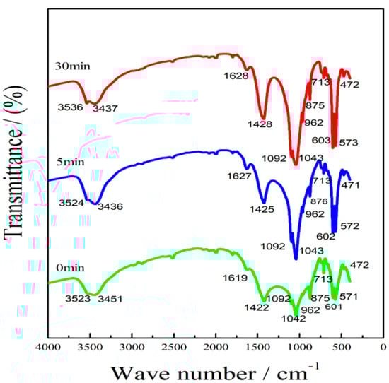 FTIR was employed to study the mineral-like isomorphism and morphology, as demonstrated by []. Figure 4 reports the IR spectra of PR2 at 0 min, 5 min, and 30 min. The three spectra demonstrate that PR2 belonged to the high-carbon fluoroapatite mineral []. In addition to the characteristic absorption of PO43−, the absorption band of CO32− could also be observed in the IR spectra of carbonate fluorapatite []. The peak at 3451 cm−1 corresponded to the stretching vibration of the phosphate hydration. The peak observed at 1042 cm−1 was a strong stretching vibration (V3) absorption, and at 1092 cm−1, its shoulder was located. These two peaks were associated with the PO43− anti-symmetric stretching vibration. The peak at 1422 cm−1 could be related to the CO32− anti-symmetric stretching vibration of the V3 absorption spectrum. The stretching vibration (V1) peak observed at 960 cm −1 corresponded to the PO43− symmetrical stretching vibration, whereas the molecular vibrational (V2) peak at 875 cm−1 belonged to the CO32− bending vibration. At lower frequencies, we could observe the V4 vibration of 571 cm−1 and the sharp band of 601 cm−1 corresponding to the PO43− bending vibration.