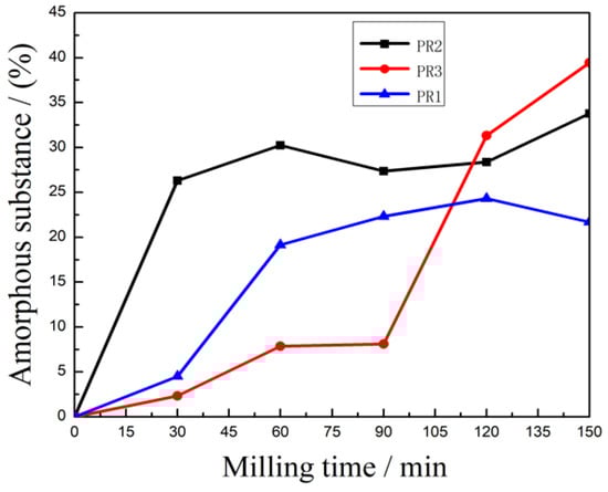 Amorphous substance of three PR powders at different milling times.