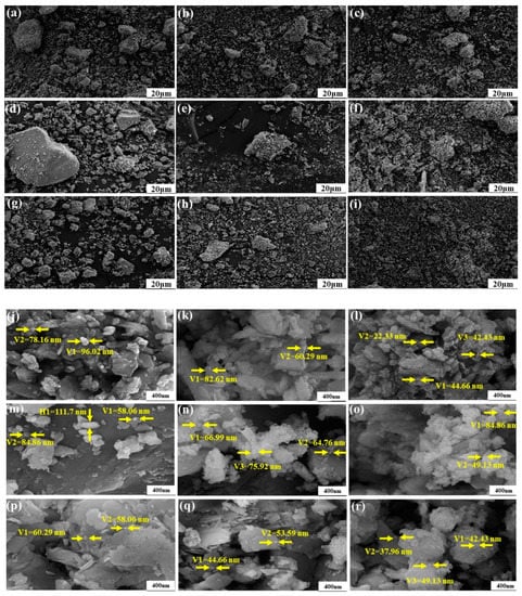 SEM images of three PR powder at different milling times: PR1 raw material (a and j), microcrystalline PR1 at 30 min (b and k) and 150 min (c and l); PR2 raw material (d and m), microcrystalline PR2 at 30 min (e and n) and 150 min (f and o); PR3 raw material (g and p), microcrystalline PR3 at 30 min (h and q) and 150 min (i and r).