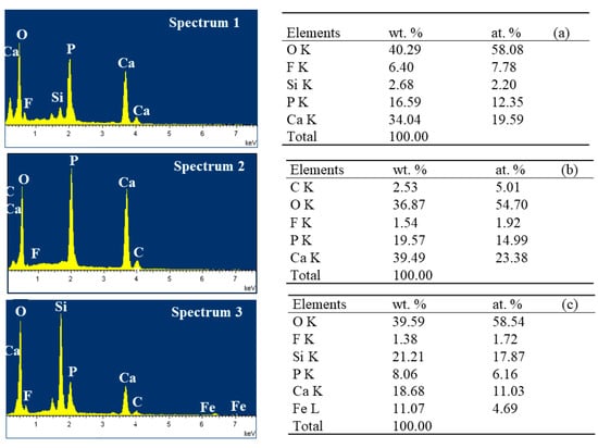 EDS shows the main elements of PR1and PR2 were O, P and Ca, the main elements of PR3 were O, Si, Ca, P, Fe (Figure 7).