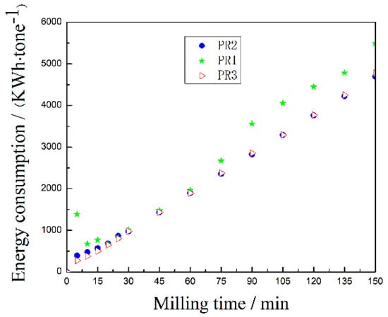 With the increase of milling time, the energy consumption of every ton of qualified PR powder followed an increasing trend (Figure 8). Furthermore, the processing cost of PR1 was higher than those of PR2 and PR3. The energy consumption values of each ton of qualified PR1, PR2, and PR3 were 5492.0 kWh, 4692.7 kWh, and 4775.0 kWh, respectively. The energy consumption of the PR1 was 17.0% and 15.0% higher than the PR2 and PR3, respectively, which suggested that the efficiency of the microcrystalline equipment was related to the presence of hard minerals as quartz.