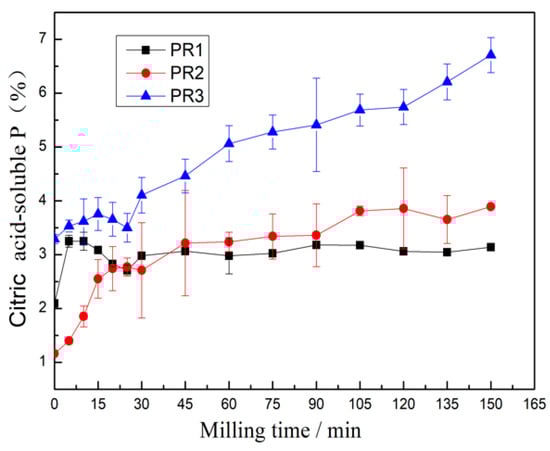 Citric acid-soluble P was measured in PR1, PR2, and PR3 ground to varying degrees (Figure 9). With the increase in milling time, the citric acid-soluble P content of the PR1, PR2, and PR3 showed an overall increasing trend. The citric acid-soluble P content values of the PR1, PR2, and PR3 after 150 min were optimal, having reached 50.1%, 234.9%, and 103.9% more than the raw materials, respectively.