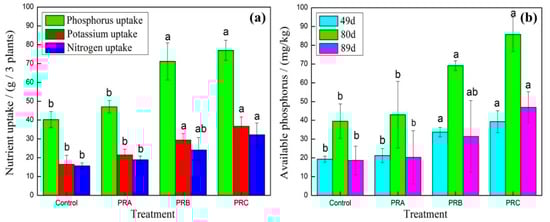 The P, K, and N uptake content (a) and available P in soils (b) of samples that underwent different treatments [reported values are statistically significant (P < 0.05)].