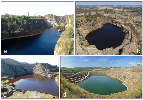 Panoramic views of four different pit lakes in Spanish mine districts, which have been selected for this study: (a) La Zarza; (b) Guadiana; (c) Brunita; and (d) Reocín. The water chemistry of these four pit lakes (major cations, sulfate, and trace metals) is given in Table 1.