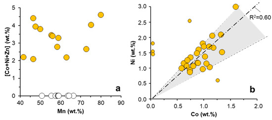 [Co + Ni + Zn] vs. Mn content (a) and Ni vs. Co content (b) measured by SEM–EDX in manganese oxides formed during Mn(II) oxidation in different mine waters. Orange circles are analyses conducted in asbolane globular aggregates from La Zarza mine water (see Figure 3c,d) whereas white circles correspond to measurements on manganite nanocrystals formed in AMD from Brunita mine (Figure 3e,f), and on birnessite crystals from Guadiana mine water (Figure 3a,b). The regression line plotted in (b) only considers the points in the shaded area (i.e., outliers excluded).