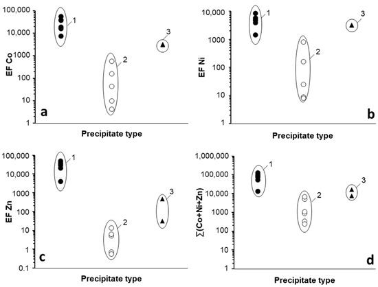 Enrichment factors (EF) of Co (a), Ni (b), and Zn (c), and cumulative trace metal content (∑(Co + Ni + Zn)) (d) for Mn oxides formed at different conditions: (1) in situ precipitates formed during slow Mn(II) oxidation in the water column of Reocín pit lake (pH 7.0–8.0) (black circles); (2) precipitates obtained in the lab during slow oxidation of dissolved Mn(II) in mine waters from Guadiana, La Zarza and Brunita (pH 8.5–9.0) (white circles); and (3) precipitates obtained in the lab during fast oxidation kinetics in neutralization experiments (pH 9.0–10.0) (black triangles). The EF values were calculated on the basis of metal (Co, Ni, Zn) concentrations in Mn oxides (Table 3), and the corresponding metal content in parent solutions (Table 1).