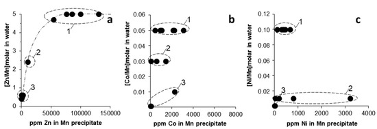 Binary plots showing the relation between trace metal content ((a) Zn, (b) Co, (c) Ni) in Mn oxides, and the corresponding molar ratio of trace metal-to-Mn in the parent solutions (Table 1) ((a) [Zn/Mn]molar, (b) [Co/Mn]molar, (c) [Ni/Mn]molar). The encircled areas represent the different Mn oxide types (1–3; legend as in Figure 5).