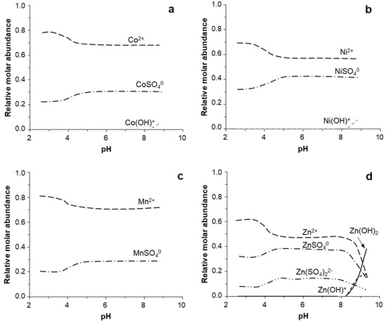 The modeled distribution of ionic species in solution showed that the studied divalent metals (Co[II], Ni[II], Zn[II] in addition to Mn[II]) were mostly present as free cations (e.g., Co2+, Ni2+, Mn2+, Zn2+) over the entire pH range of 2–9 (Figure 8). These free ions represented 60–80% of the total metal concentration, while the remaining was mostly dominated by neutrally-charged sulfate complexes of the type M2+SO40 (e.g., CoSO40, NiSO40). Hydroxyl species of the type Co(OH)+ or Ni(OH)+ became only significant at pH > 9, when they reached up to 10% of the total metal concentration (Figure 8a,b). In the case of Zn, the hydroxide form Zn(OH)2 became the dominant species at pH > 9.0 (Figure 8d). Overall, the presence of Co, Ni, and Zn as free metal ions favored their incorporation into Mn(II) oxides, either by ion substitution for other cations or by adsorption onto negatively charged surfaces [1,2,3,4].