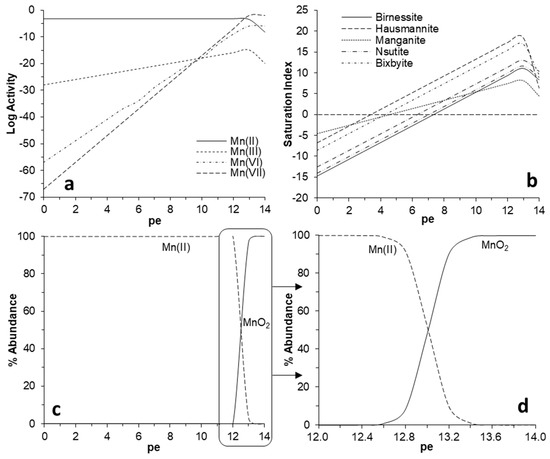 (a) Variation of ionic activities for different Mn species (Mn(II), Mn(III), Mn(VI), Mn(VII)) in the pe range 0–14. (b) Solubility of different manganese oxi-hydroxides (as defined by their corresponding saturation index) in the pe range of 0–14. (c) Relative distribution (in % molar abundance) of Mn(II) vs. MnO2. (d) Enlargement of (c) showing the evolution of Mn species in the critical pe range of 12–14. Calculations conducted with PHREEQCI using the minteqa2.v4 database. For all plots, the conditions were chosen to roughly resemble typical water composition of Guadiana and La Zarza mine pit lakes (T = 25 °C, pH = 8.5, [Mn] = [Na] = 10−3 M, [Ca] = 10−2 M, [K] = 10−4 M).