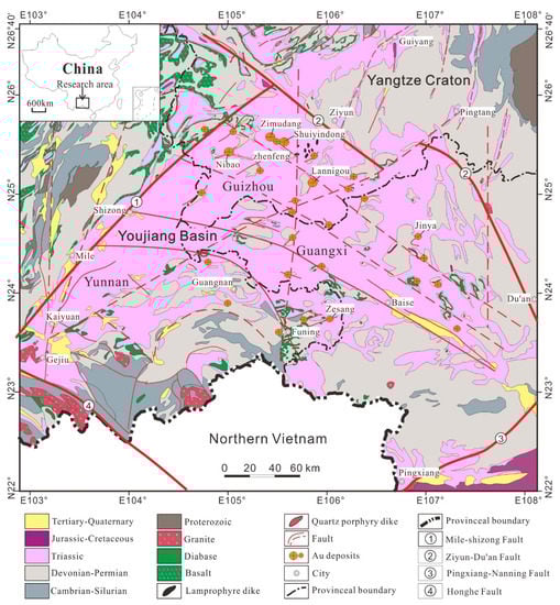 Carlin-type gold deposits in the Dian–Qian–Gui area are restricted to the Youjiang Basin (Figure 1). The basin is bound to the northwest and northeast by the Mile–Shizong fault and Ziyun–Du’an fault, respectively, separating the basin from the Yangtze Craton [,]. The southwestern and southeastern margins of the basin are separated from the Simao and Cathaysia blocks by the Honghe and Pingxiang–Nanning faults, respectively [,].