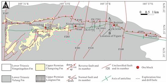 Geological cross section A–B through the Shuiyindong mining area (looking west) showing its major structures and stratigraphic units.