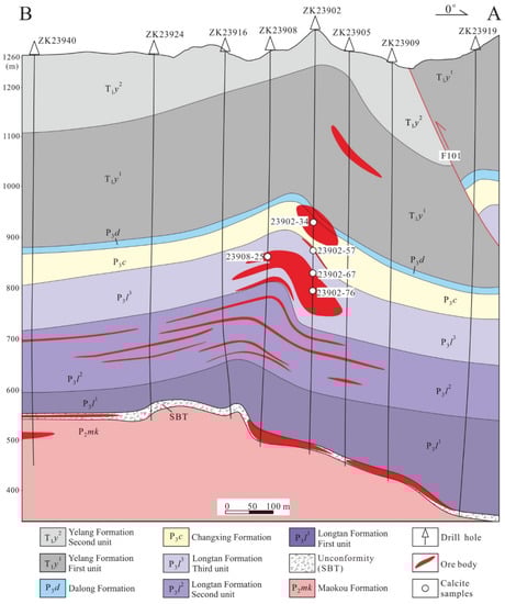 Six fluorite samples were collected from drill holes ZK16701, ZK17501, ZK19901, and ZK24304 of SBT at depths of 600–747 m below the surface (Figure 2). Five calcite samples, containing intergrown realgar and orpiment, were collected from drill holes ZK23908 and ZK23902 at depths of 376–522 m below the surface (Figure 3). Pure fluorite and calcite separates were hand-picked under a binocular microscope and crushed to 200 mesh in an agate mortar.