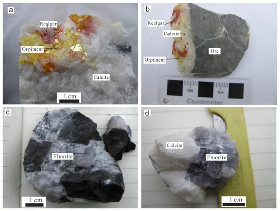 Photographs of calcite and fluorite samples from Shuiyindong. (a,b) Calcite samples containing intergrown realgar and orpiment from drill cores at the periphery of decarbonated rocks; (c,d) fluorite samples cementing argillite breccia or intergrowth with calcite at the vicinity of SBT.