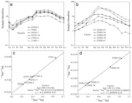 REE concentrations and Sm–Nd isotopic compositions of fluorite and calcite are shown in Figure 5 and listed in Table 1 and Table 2, respectively. All the samples contained considerable ΣREE concentrations (12.3–25.6 μg/g for fluorites and 5.71–31.7 μg/g for calcites) and variable Sm/Nd ratios (0.52–1.03 for fluorites and 0.57–1.71 for calcites). Chondrite-normalized REE patterns of fluorite and calcite all showed MREE enrichment characteristics (Figure 5a,b). However, fluorite and calcite exhibited certain apparent differences between their REE patterns. Fluorite was characterized by negative Eu anomalies (δEu = 0.67–0.78; Table 1) and a parabolic shape, with the peak between Gd and Ho (Figure 5a), whereas calcite was characterized by positive Eu anomalies (δEu = 1.01–1.54; Table 1) and a hump shape with the peak on Eu (Figure 5b).