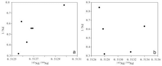 The linear relationships shown in Figure 5c,d represent isochrons or mixed lines with two end members having quite different 143Nd/144Nd and 147Sm/144Nd ratios. In the former, the slopes of the straight lines determine the ages of fluorite and calcite; in the latter, the slopes have no meaning but simply reflect the isotopic compositions and Sm/Nd ratios of the two end members. The variation in Sm/Nd ratios is not attributable to the mixing of the two end members because this would result in variable initial values. The values of fluorite and calcite range from −4.2 to −4.4 and from −1.1 to −1.2, both showing slight variations. In addition, no linear relationships could be determined from the 1/Nd vs. 143Nd/144Nd diagrams for fluorite and calcite (Figure 6). Therefore, the possibility of a mixing line can be rejected.