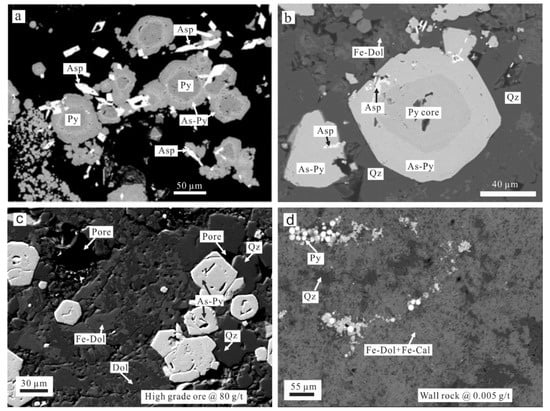 Backscattered electron (BSE) image of selected ore as well as wall rock from Shuiyindong. (a,b) BSE image of ores containing zoned arsenian pyrite (showing As-rich rims on As-poor pyrite cores) and arsenopyrite (after Su et al. [,]). (c) BSE image of high-grade ore showing decarbonatization and high porosity. (d) BSE image of wall rock showing no decarbonatization and nonporous. Abbreviations: Asp—arsenopyrite, As-py—arsenian pyrite, Dol—dolomite, Fe-Cal—ferroan calcite, Fe-Dol—ferroan dolomite, Py—pyrite, Qz—quartz.