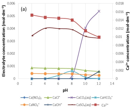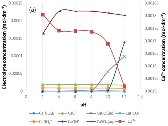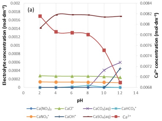 Figure 12 shows the distribution of Ca2+, Mg2+ and Na+ in 10SPW for a pH range of 2–12. As the pH increases from pH 2, [Mg2+], [Ca2+] and [Na+] decrease and thus other species form. It can be seen that in Figure 12a,b there is a strong presence of CaSO4(aq) and MgSO4(aq) in solution. A similar observation can be made from Figure 12c with regard to NaSO4−, although this anionic species shows to have the highest concentration at pH 7 in Na distribution. Also, at pH > 7 CaCO3(aq), MgCO3(aq) and NaCO3− showed an apparent increase in concentration whereas CaHCO3+, MgHCO3+ and NaHCO3(aq) were seemingly significant at 4 < pH < 12.