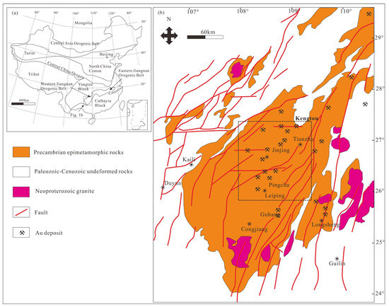 (a) Geological sketch map of China (modified from [8,16]); (b) Geological map of the western part of Jiangnan Orogenic Belt, showing the location of Precambrian rocks, granitic intrusions and gold deposits (modified from [8,17]).