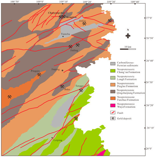 Geological map of the Southeast Guizhou, showing the location of Precambrian rocks, gold deposits (modified from [8,26]).