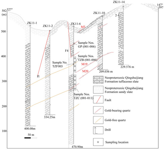 Samples of sandy slate (Sample Nos. TZB001–TZB006 and TZD002), tuffaceous slate (Sample Nos. TZC001–TZC011 and TZD001), gold-free quartz vein (Sample No. TZF003), and gold-bearing quartz veins (Sample Nos. GP1–GP10 and TZD003) were collected from the drill-cores. Figure 3 shows the sampling locations.
